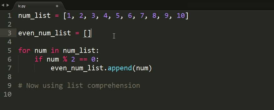 num_list = [1, 2, 3, 4, 5, 6, 7, 8, 9, 10]এখন আপনাকে যদি বলা হয় পাইথনে একটি কোড লিখতে যেটা কিনা সংখ্যাগুলো থেকে শুধু জোড় সংখ্যাগুলো নিয়ে আরেকটি লিস্ট তৈরি করতে এবং আপনার যদি লিস্ট কম্প্রিহেনশন সম্পর্কে ধারণা না থাকে তাহলে আপনি অবশ্যই এভাবে লিখবেন,